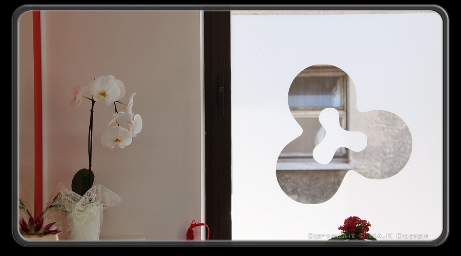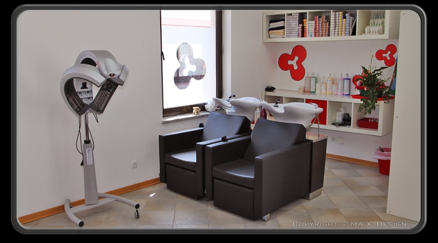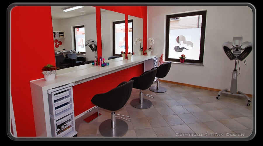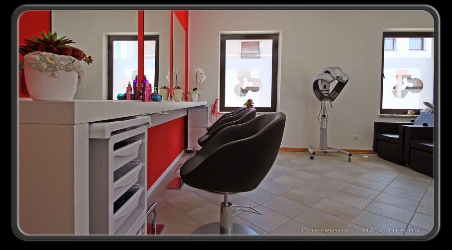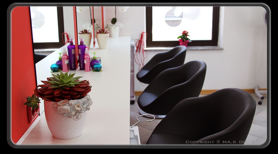 Mlada frizerka, ki se je na samostojno podjetno pot podala prvič se je odločila, da bo v podnajemniškem lokalu z minimalnimi stroški opremila frizerski salon po svojem okusu. Potrebni sta bili samo dve potezi: samolepilne nalepke in pobarvana stena. In že je prostor "zadihal" po njeno. Leseno pohištvo je bilo delno izdelano po meri, delno pa dobavljeno pri znanem proizvajalcu - Ikei. Frizerska oprema je bila dobavljena pri dobavitelju za profesionalno opremo frizerskih salonov.
