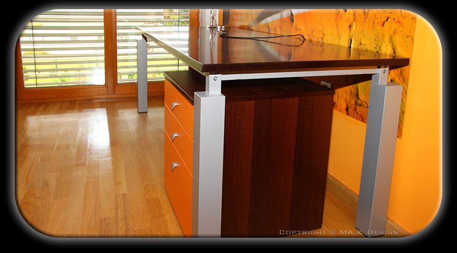 Pisalna miza v wengejevem furnirju s kovinskim podnožjem in predalnik na koleščkih.